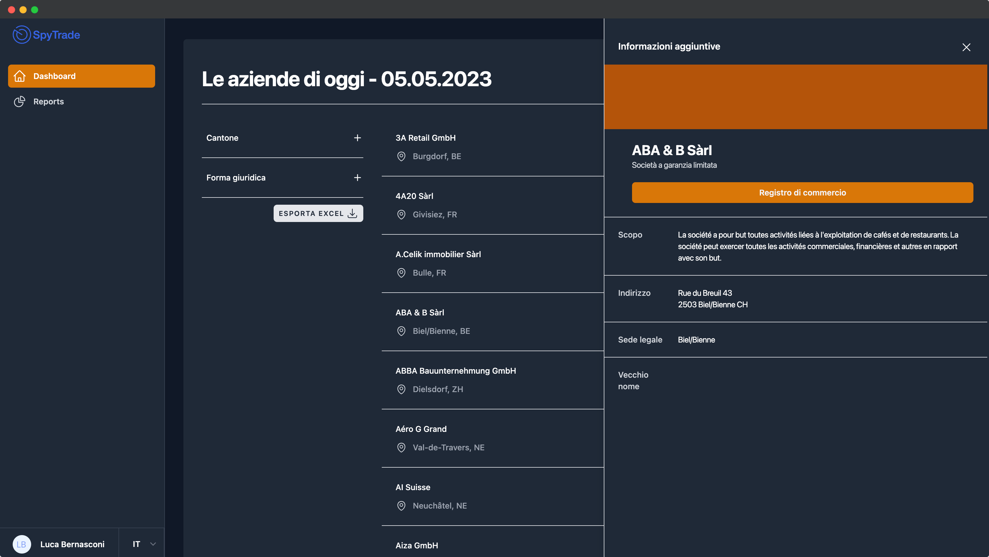 Le funzionalità di SpyTrade sono semplici ed efficenti. Principalmente: permette di scaricare giornalmente dei report con le aziende iscritte il giorno stesso al registro di commercio.